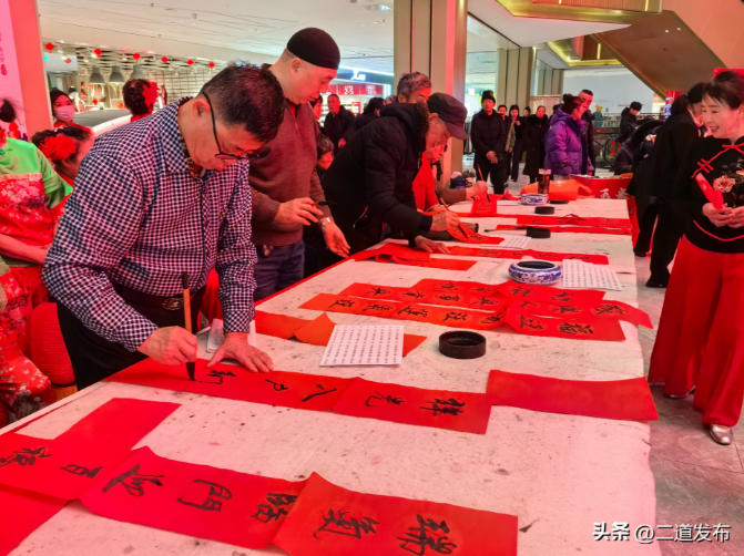 活动现场划分多个区域。在冰雪主题书画展区,一幅幅描绘北国雪景的作品,生动展现东北地区独特的冰雪风情。来自二道区老年书画研究会亚泰分会的成员现场挥毫,为居民书写春联和“福”字,传递新春祝福。