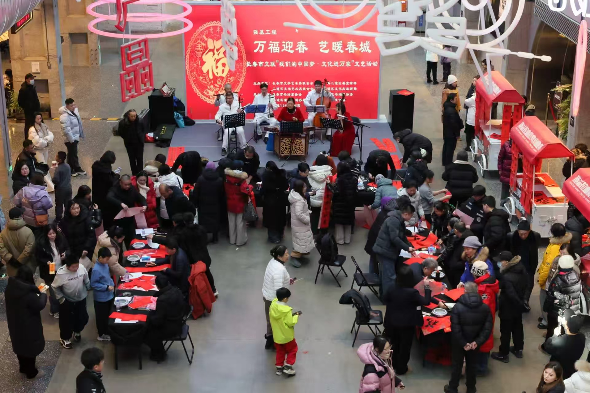 无联不成春,有联春更浓。1月27日,由长春市文学艺术界联合会、中共二道区委宣传部、二道区文学艺术界联合会、二道区文化和旅游局共同举办的“我们的中国梦·文化进万家”文艺活动在长拖1958文创园开展。活动以“万福迎春 艺暖春城”为主题,设立了春联福字、新春福卡文创书签发放区,“拓印金福”体验区和雅乐迎春欣赏区,为游客和居民送上新春祝福。