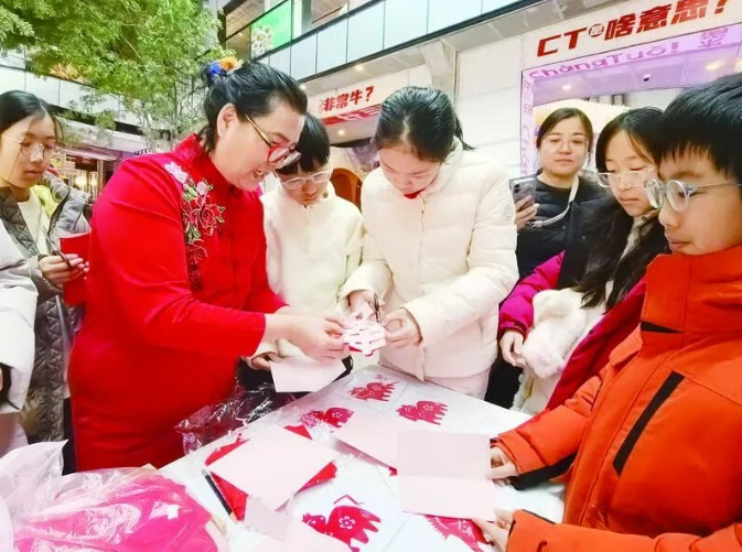 剪纸区的长桌上,民间艺人王桂荣正带着孩子们剪窗花。“来!咱们一起学。把纸放平,红色朝上,对折,再对折……”剪刀在她手中灵巧翻转,不一会儿就“变”出一个“喜”字。得知南方孩子从未贴过窗花,她还特意备好100幅小马窗花相赠。