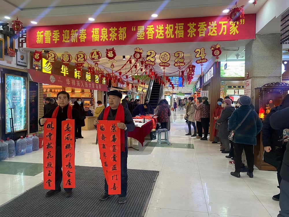 赋诗、品茶、赏花,是春节期间人们都会参与的传统民俗,蕴含着美好喻义,在新春佳节即将来临之际,福泉茶都联合紫盈社区开展“新冬季 迎新春 墨香送祝福 茶香送万家 ”活动,结合中国二十四节气,为大家普及茶道与日常保健知识,还为大家演示茶艺冲泡过程并带领大家一起体验泡茶,感受茶道文化,同时还特邀书法协会老师共聚茶城书写春联,为大家送上龙年新春的祝福,营造欢乐、喜庆、祥和、浓郁的迎春氛围,用笔尖传递幸福“年”味!把茶城人的温暖和对新春的祝福,送至居民心中。