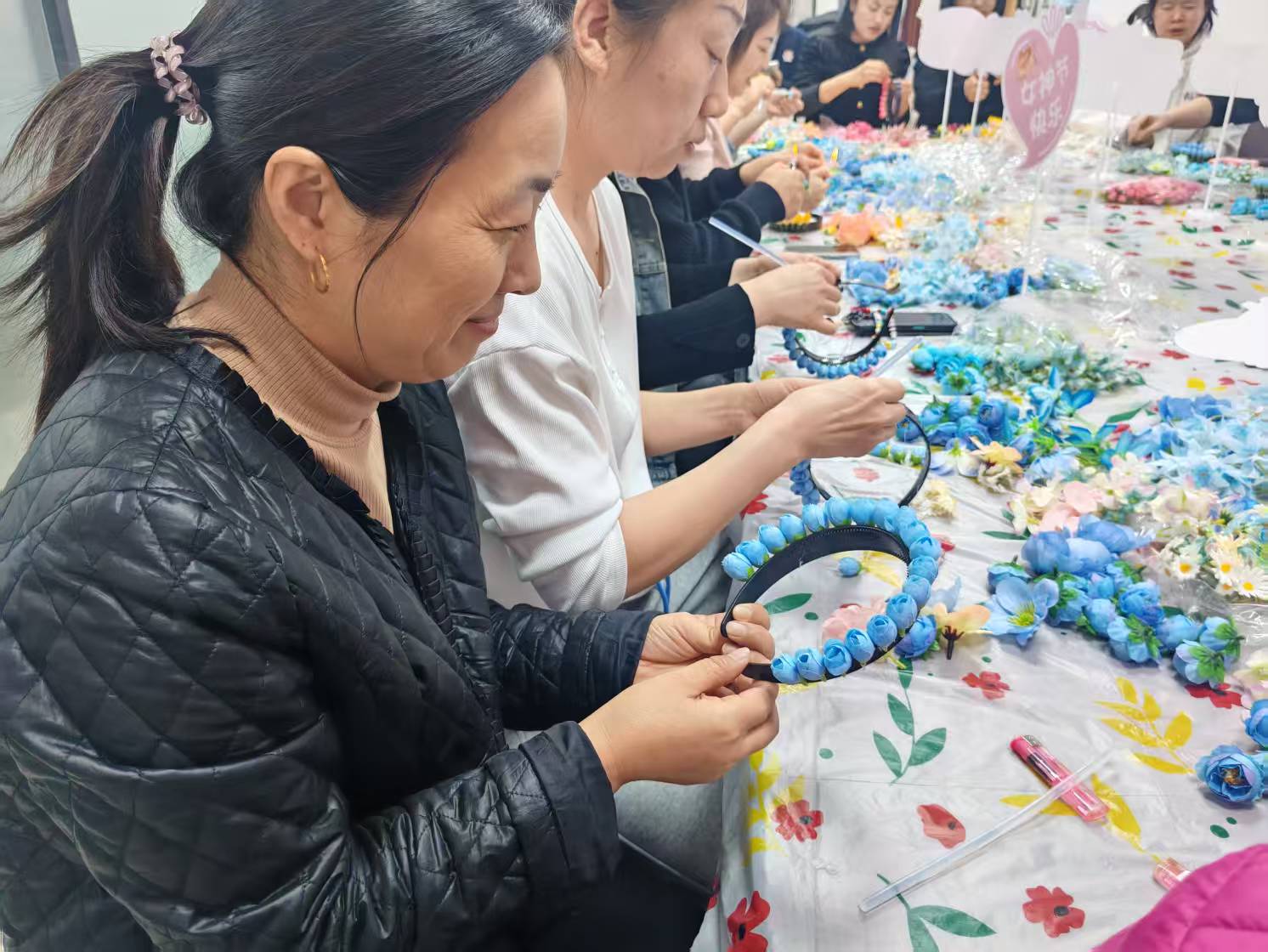 簪花制作,把浪漫和春天戴在头上。近日,荣光街道长拖社区的活动室格外热闹,辖区女性同胞围坐在一起,体验簪花的制作乐趣。