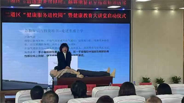 东盛社区卫生服务中心家庭医生柳春丽为师生进行健康教育大讲堂首讲《应急救护知识培训》