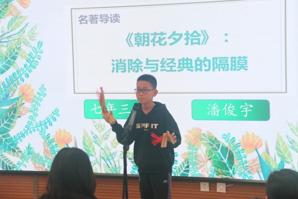 高子超同学苦练评书技法,重现《孙悟空大闹五庄观》的精彩瞬间;孟令艺、耿雯宣两位同学说、学、逗、唱,样样精通,在一片欢乐中带领大家领略《中华上下五千年》的风采;潘俊宇同学出人意料地用快板表演《朝花夕拾》,爽朗大方的表演让人耳目一新,印象深刻。