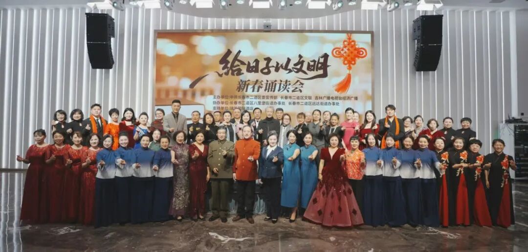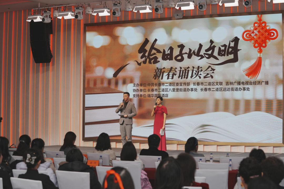 春潮载韵,岁暖山河;文明润心,诗语传香。为全面促进文明实践,促进文化惠民,深度建设书香社会,积极响应省思想政治工作研究会发出的春节前“送温暖”的活动倡议,农历春节前夕,由中共长春市二道区委宣传部、二道区文联、吉林广播电视台经济广播主办,长春市二道区八里堡街道办事处、长春市二道区远达街道办事处协办的“给日子以文明”新春诵读会 ,在长春市二道区瑞华国际酒店举办,活动通过吉林经济广播视频号全程直播,吸引网端数万名网友与现场观众共同观看,沉浸式感受诗歌诵读魅力,生动呈现“全民阅读·书香社会”的美好风貌。