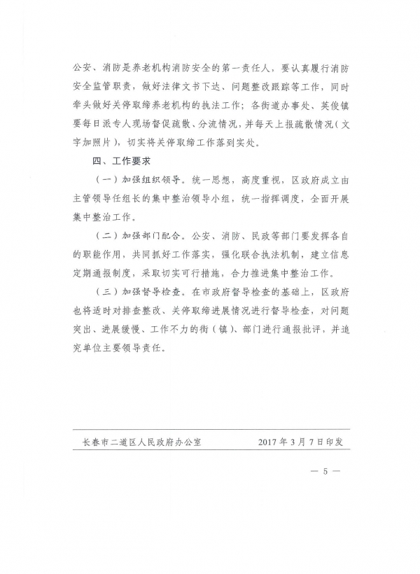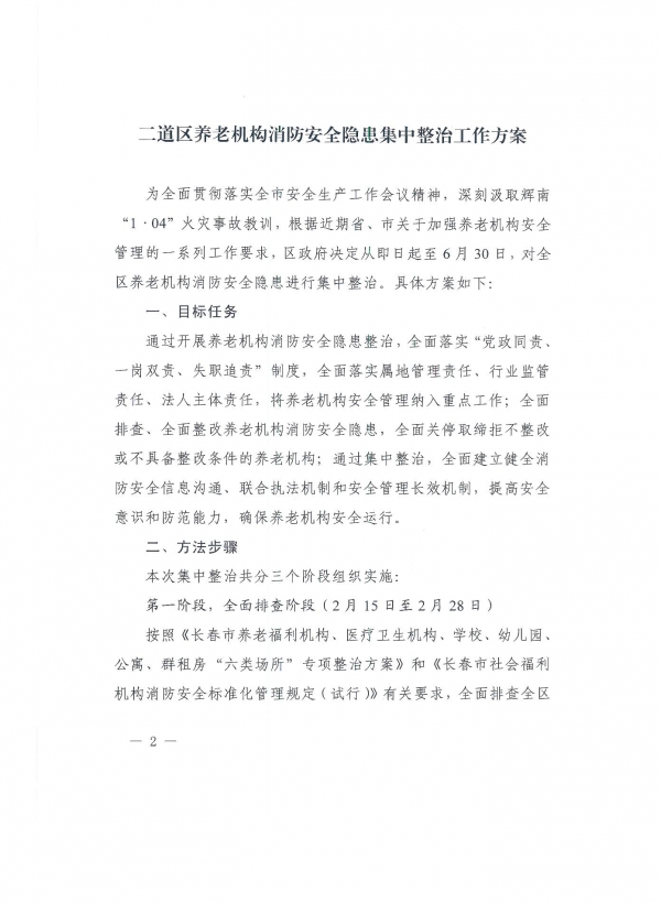 长春市二道区人民政府办公室关于印发《二道区养老机构消防安全隐患集中整治工作方案》的通知